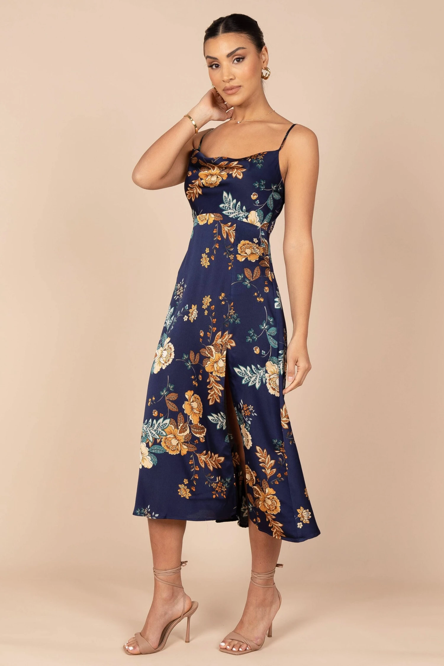 | DETAILS This midi length dress is the perfect addition to your wardrobe. With a cowl neckline, thin adjustable straps and hook and eye clasp, it’s both fashionable and comfortable. An invisible back zip offers an easy on/off option while a front side split adds an elegant touch to its design.