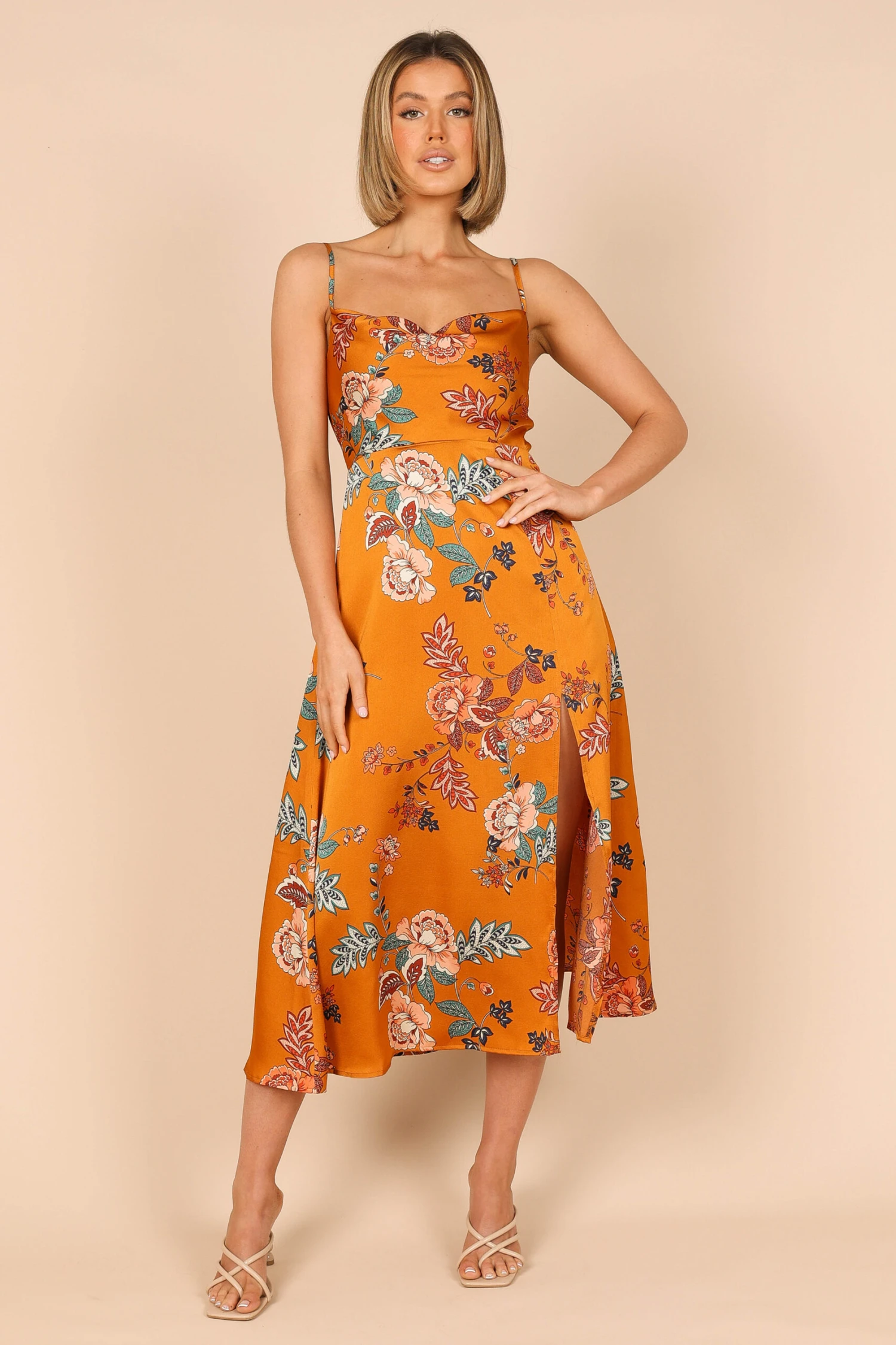 | DETAILS Look no further for the perfect midi dress for your next night out! This midi length beauty has it all: a cowl neckline, thin adjustable straps and a hook and eye clasp. The invisible back zip adds an extra layer of sophistication to this look, along with the front side split for added drama.