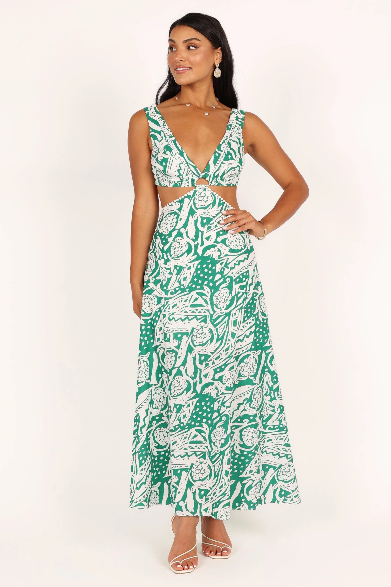| DETAILS Make a statement this season with our gorgeous maxi length dress. Featuring a flattering v-neckline and front ring detail under the bust, you’ll love the cut out feature that adds an exciting edge.