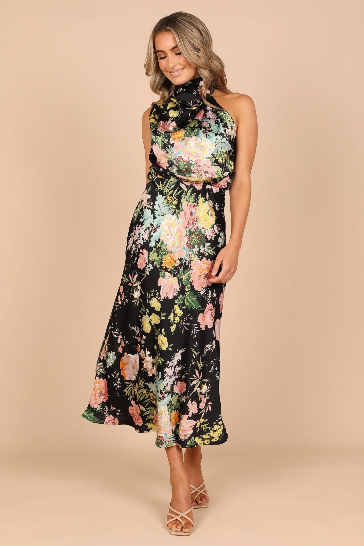 | DETAILS Look and feel your best in this stunning event wear dress! Featuring a midi length, an asymmetric high round neckline with gathered pleat detail, plus a back neck opening with button close, it’s the perfect party dress for any special occasion. Not only does it look fabulous, but it feels as good as it looks too — crafted from a soft satin feel just for extra comfort.
