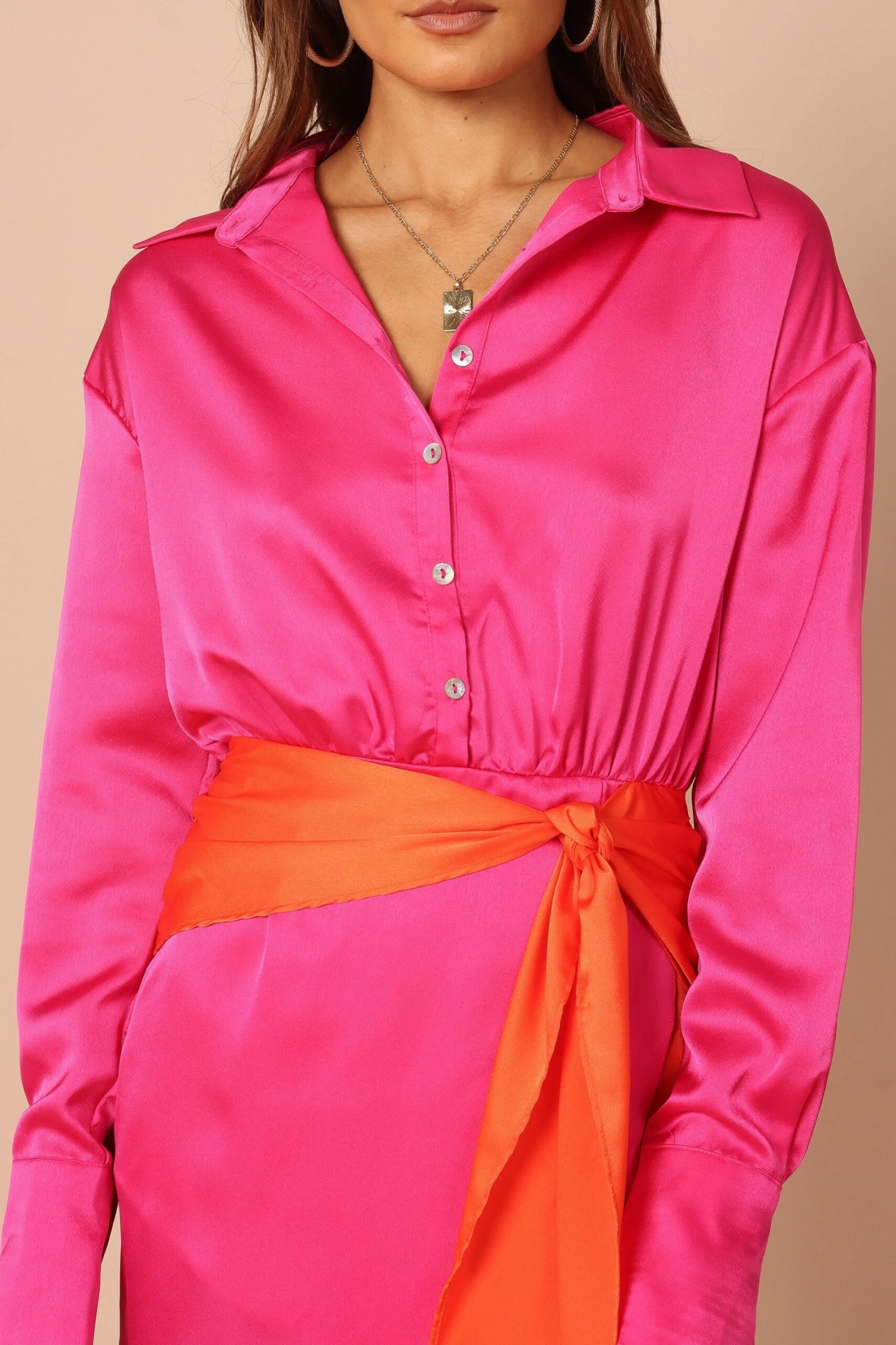 | DETAILS Make a statement in this stunning maxi length collared dress! Featuring long sleeves with button close cuffs, functional buttons down the front, and a waist tie detail for an extra touch of elegance. The side invisible zip ensures ease of wear while the front overlay wrap design adds to its unique charm.
