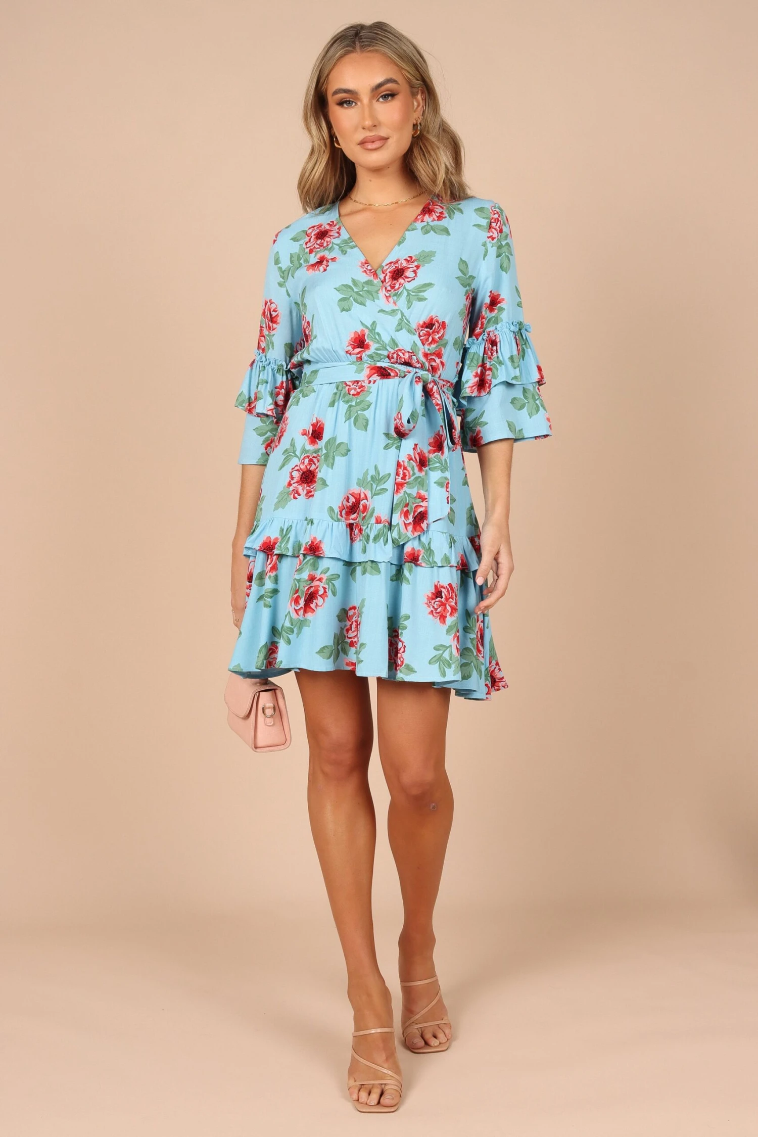 | DETAILS Get ready to turn heads in this stunning floral print dress! The above knee length and overlay neckline with button closure give it a sophisticated yet flirty feel. The mid length sleeves with ruffle detail add an extra touch of femininity, making this dress perfect for any occasion.