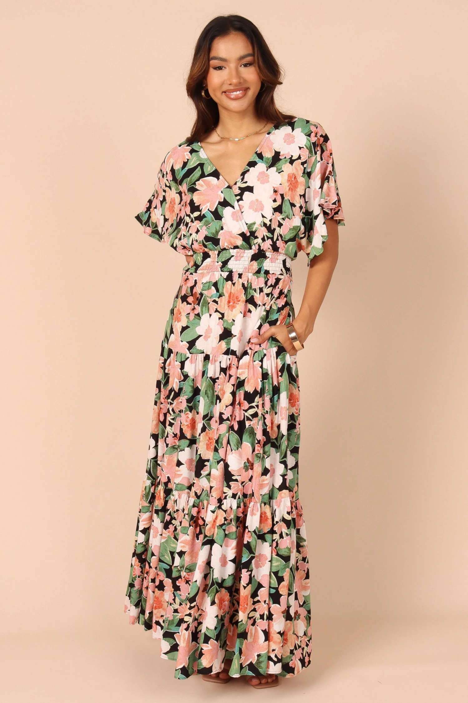 | DETAILS We are loving our new maxi length V-neck dress with button clasp closure. Featuring an elasticised waistband and functional pockets, this dress is perfect for any occasion. The short sleeves have a playful ruffle cuff, while the tiered gathered skirt panels give it that extra touch of femininity.