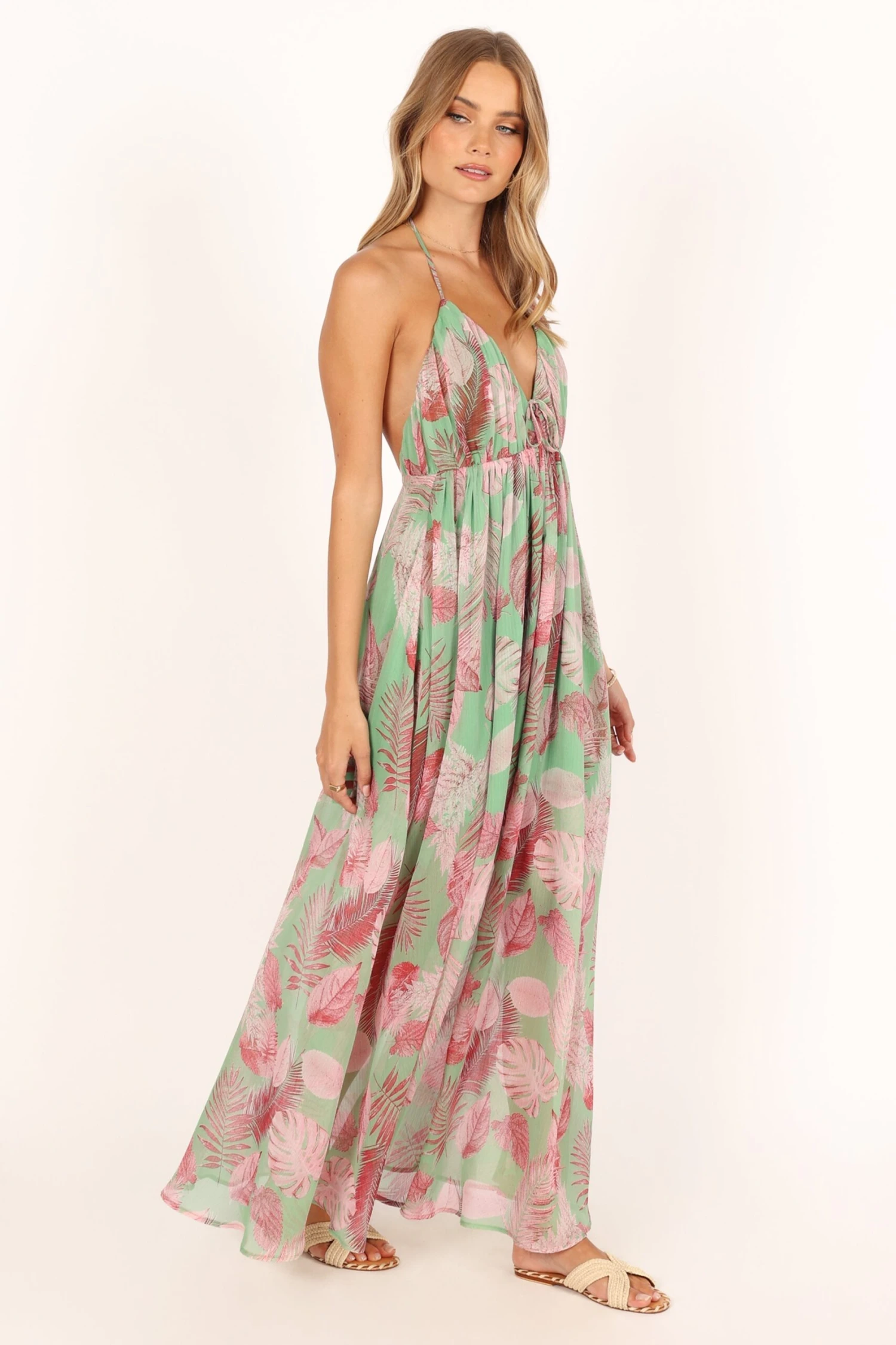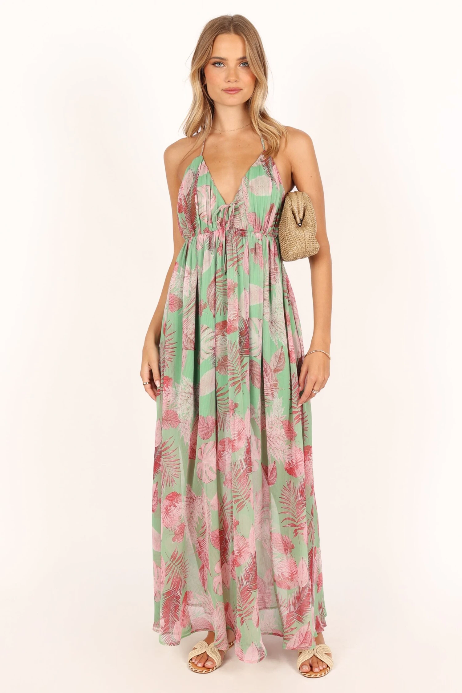 | DETAILS This halterneck style dress features an eye-catching red leaf print that captures the essence of summer beautifully. With a maxi length, this elegant dress offers a flattering V neckline, ensuring you stay comfortable and confident wherever you choose to wear it.
