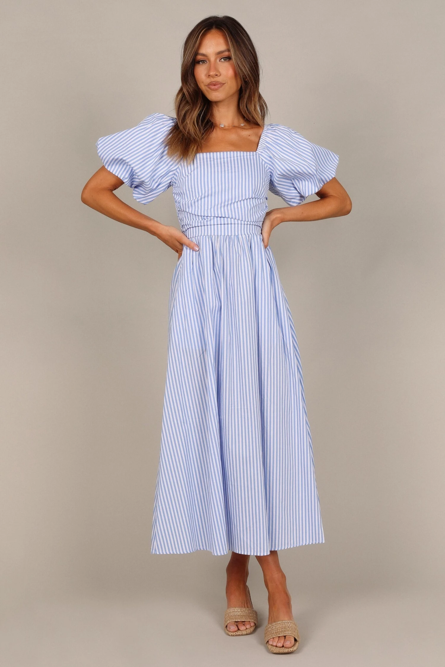 | DETAILS Welcome spring with this flirty midi dress! Featuring a square neckline and short puff sleeves with elasticised cuffs, it has an all-over blue stripe pattern that is sure to make you stand out from the crowd.