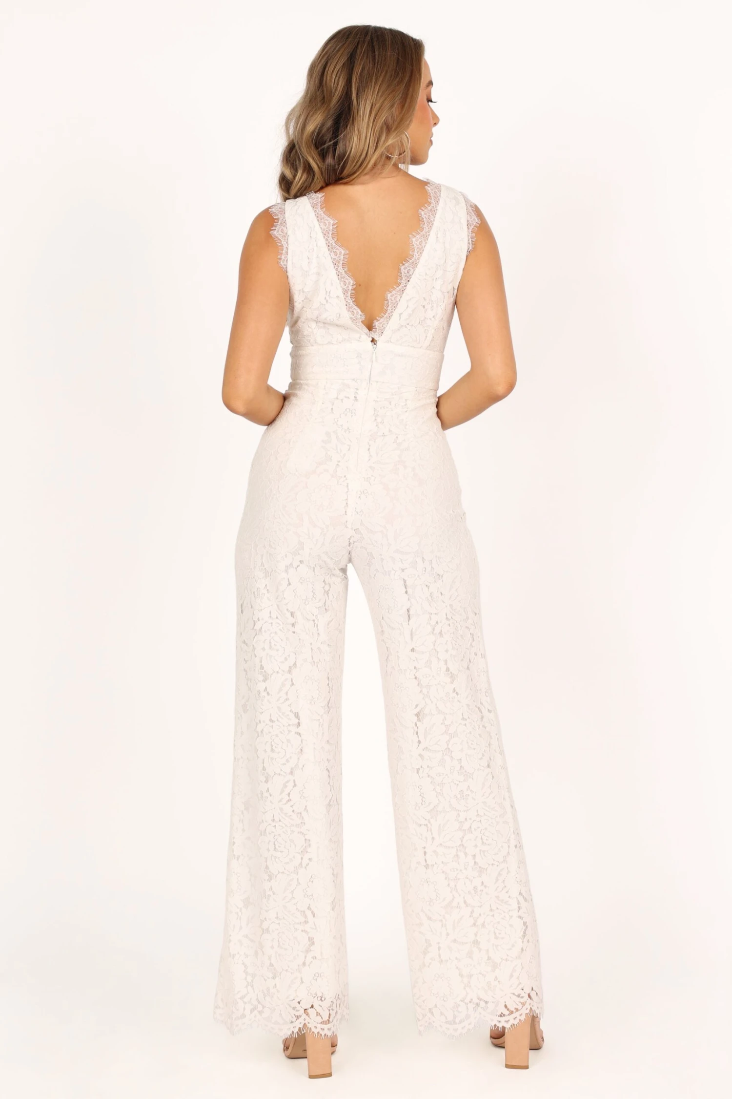 | DETAILS Are you ready to make a statement at your next event? Turn heads with this stunning lace jumpsuit! Featuring a v neckline, non adjustable shoulder straps and back v detail for an elegant silhouette.
