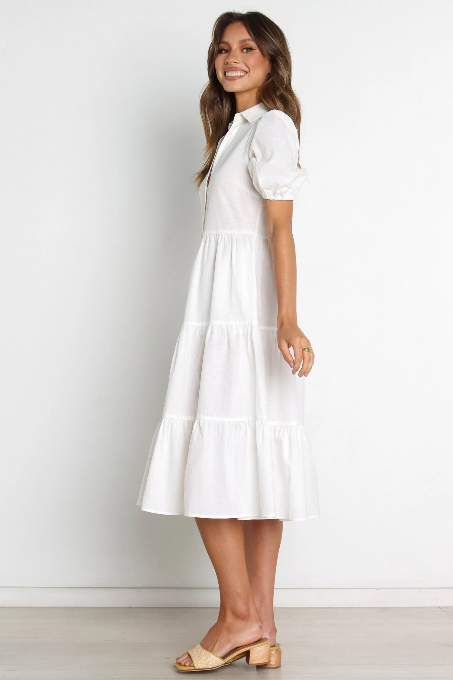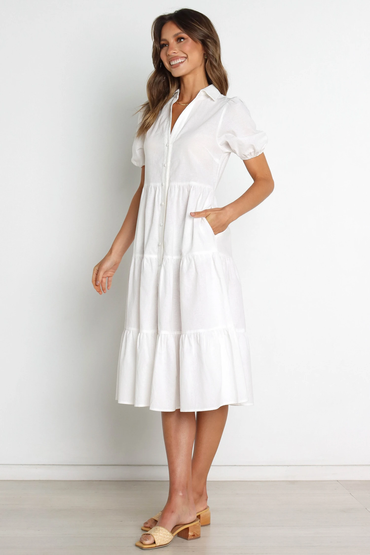 | DETAILS This lovely midi dress is the perfect addition to your wardrobe for any occasion! Designed with a flattering collared v neckline and short sleeves with elasticised cuffs, this dress will have you feeling beautiful and confident. The front functional button close and functional pockets make it easy to wear and practical too!