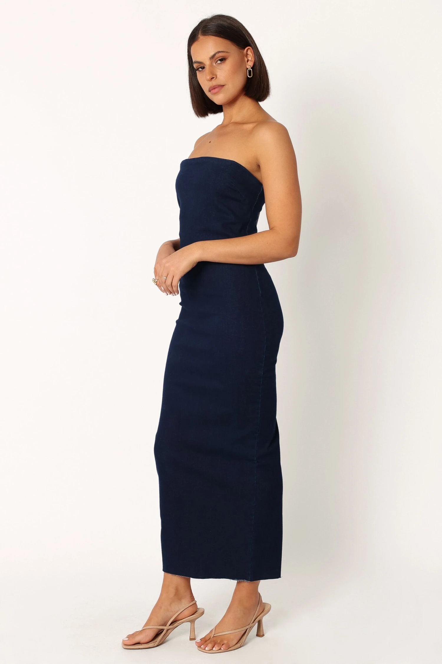 | DETAILS The perfect maxi length dress for making a statement this season is here. Introducing this stunning denim strapless style – the ideal choice for special occasions or casual days out.
