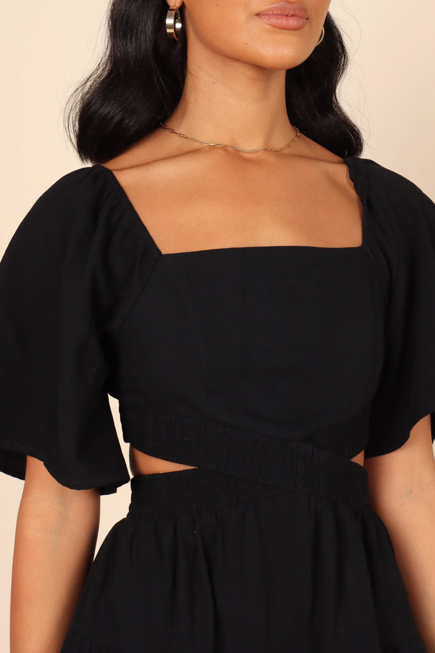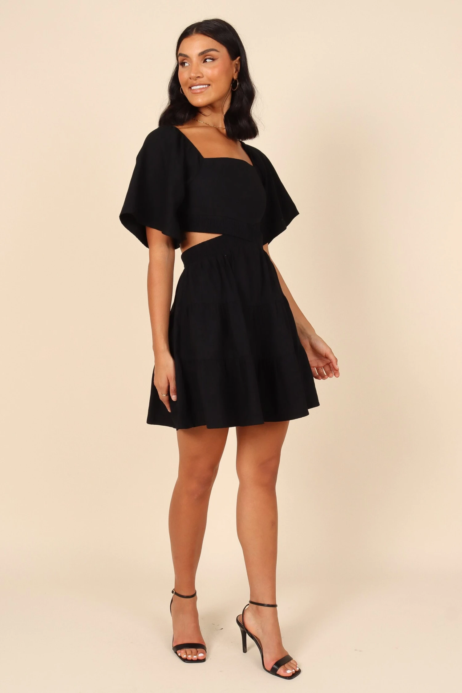 | DETAILS This party dress is the perfect pick for a fun-filled night of dancing and celebrations! With an above knee length, square neckline, short sleeves, back shirred panel and front twist design, you’ll look your best in this stunning ensemble.Â