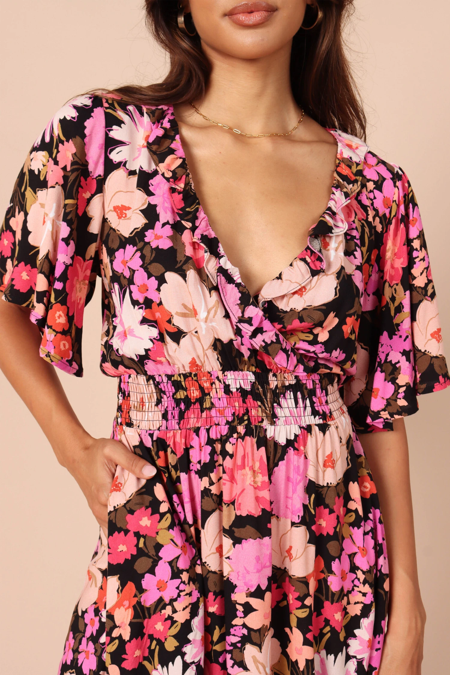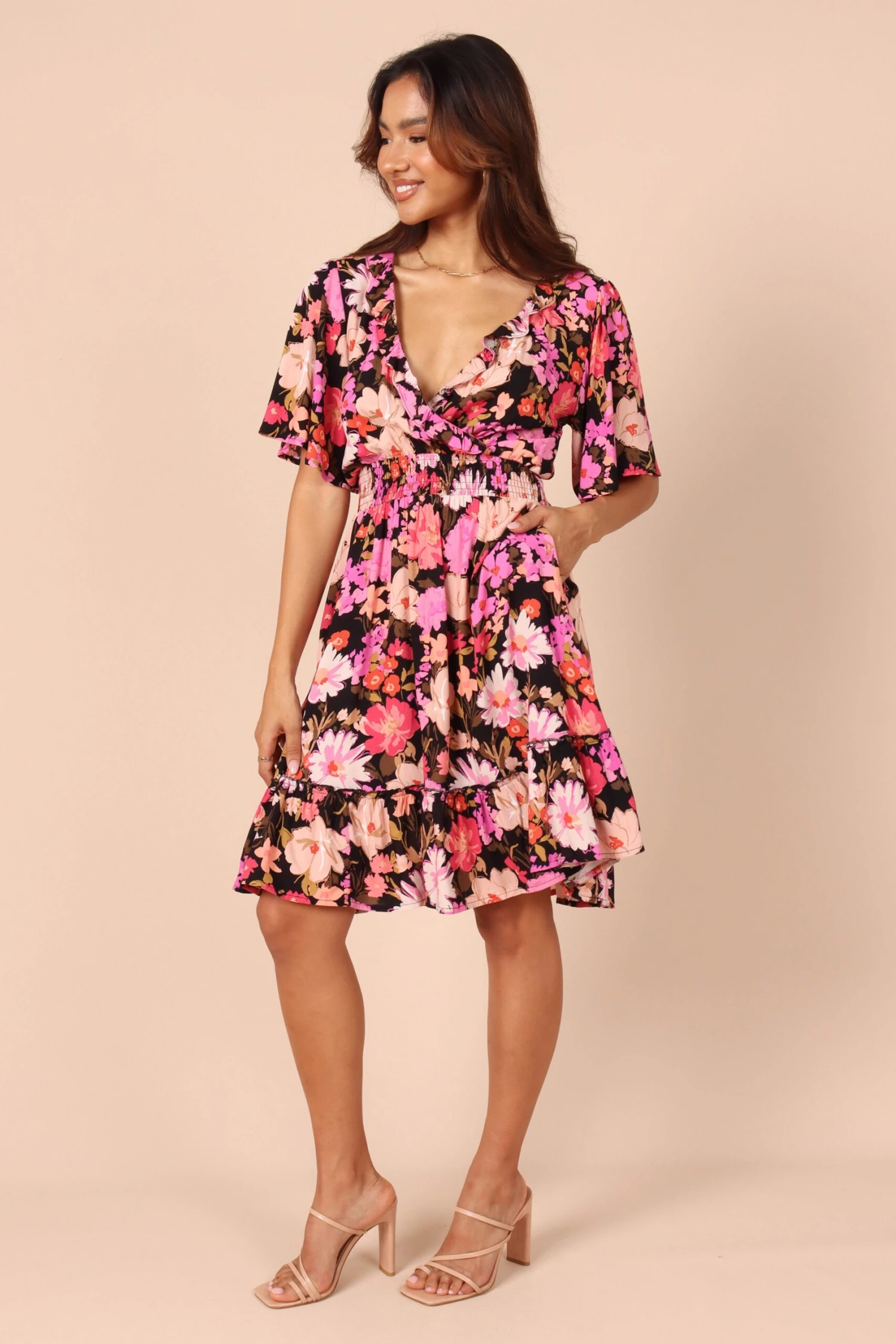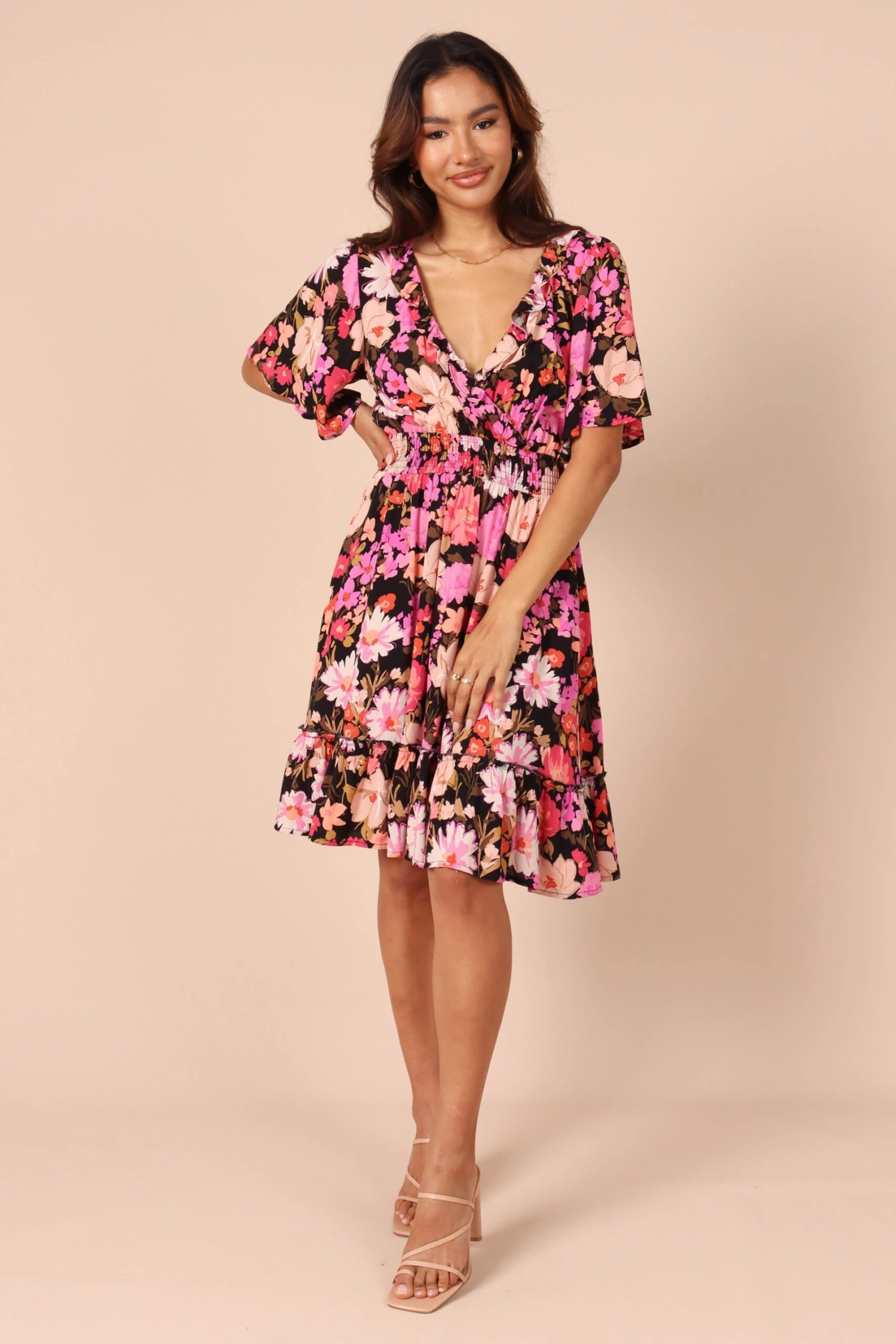 | DETAILS Dress to impress in our Floral Mini Summer Dress! This statement dress is crafted from a lightweight fabric with a beautiful floral print. The overlay neckline features delicate ruffle detailing, while the short bell sleeves add a romantic touch.Â