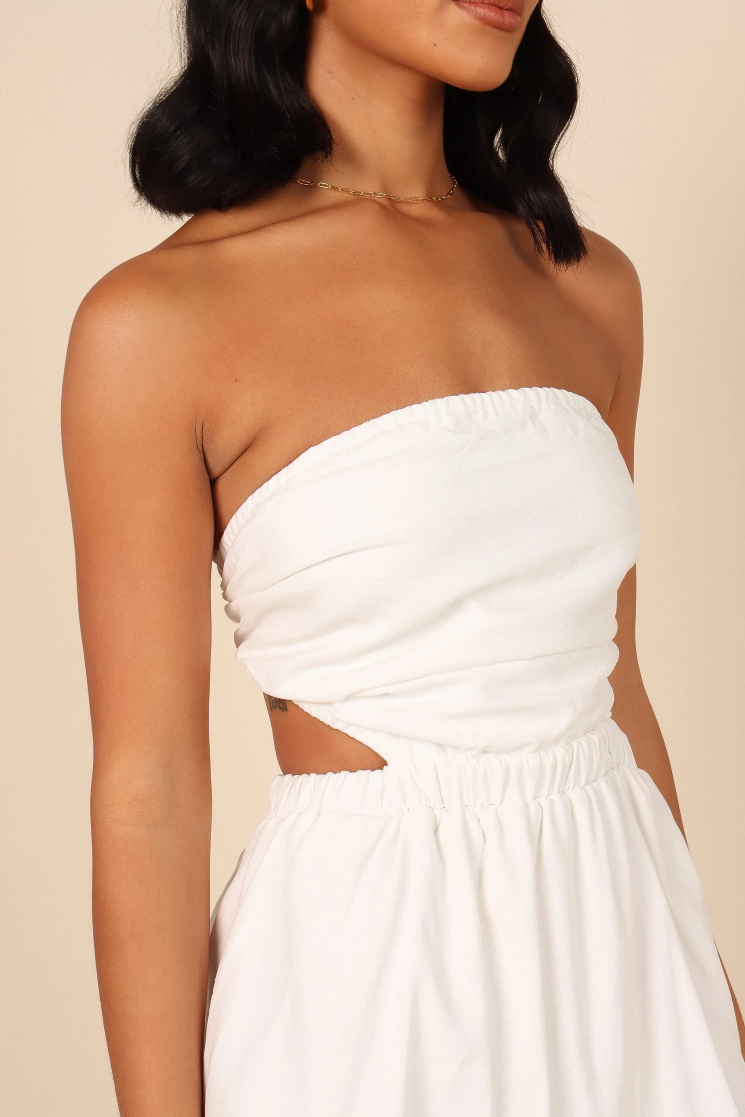 | DETAILS This strapless mini dress is sure to turn heads! Featuring a flirty above knee length, an open back with elasticised strap and side cut out detail, you’ll be showing off all the right places.Â