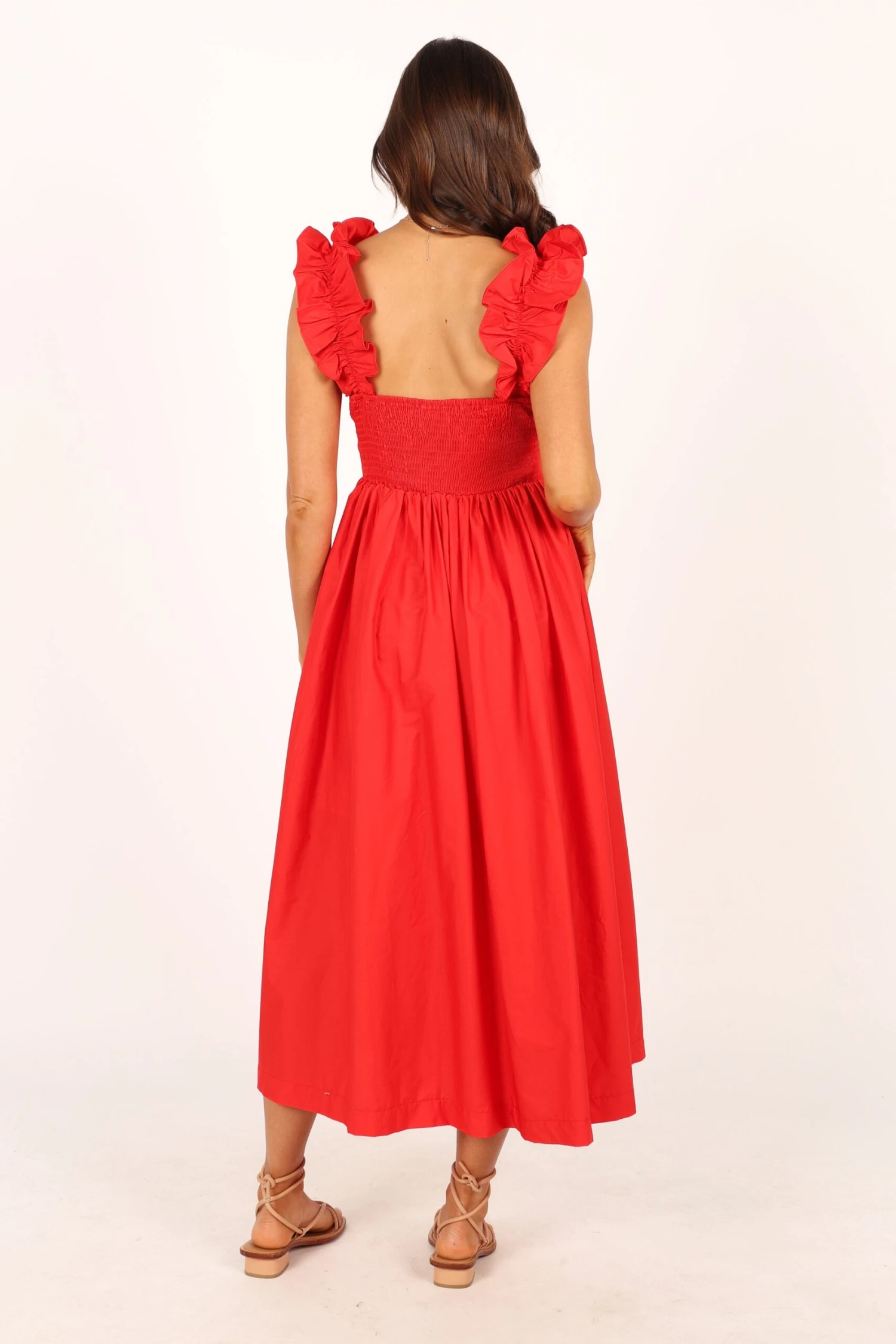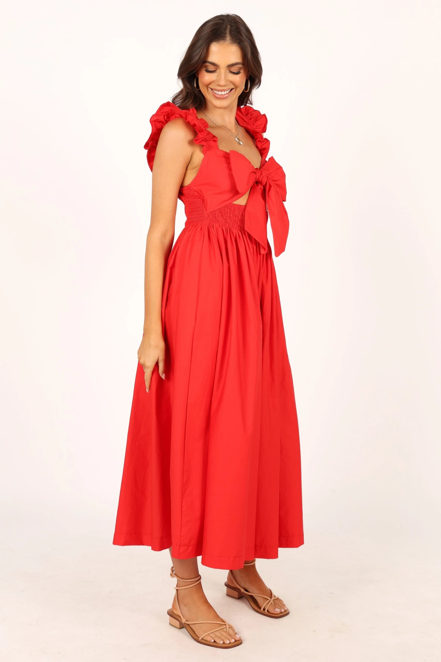 | DETAILS This beautiful red midi dress is here to make you look and feel fabulous! Featuring an elegant sweetheart neckline, elasticised straps with a ruffle detail, and an attached front tie bust feature, this dress is full of feminine charm.