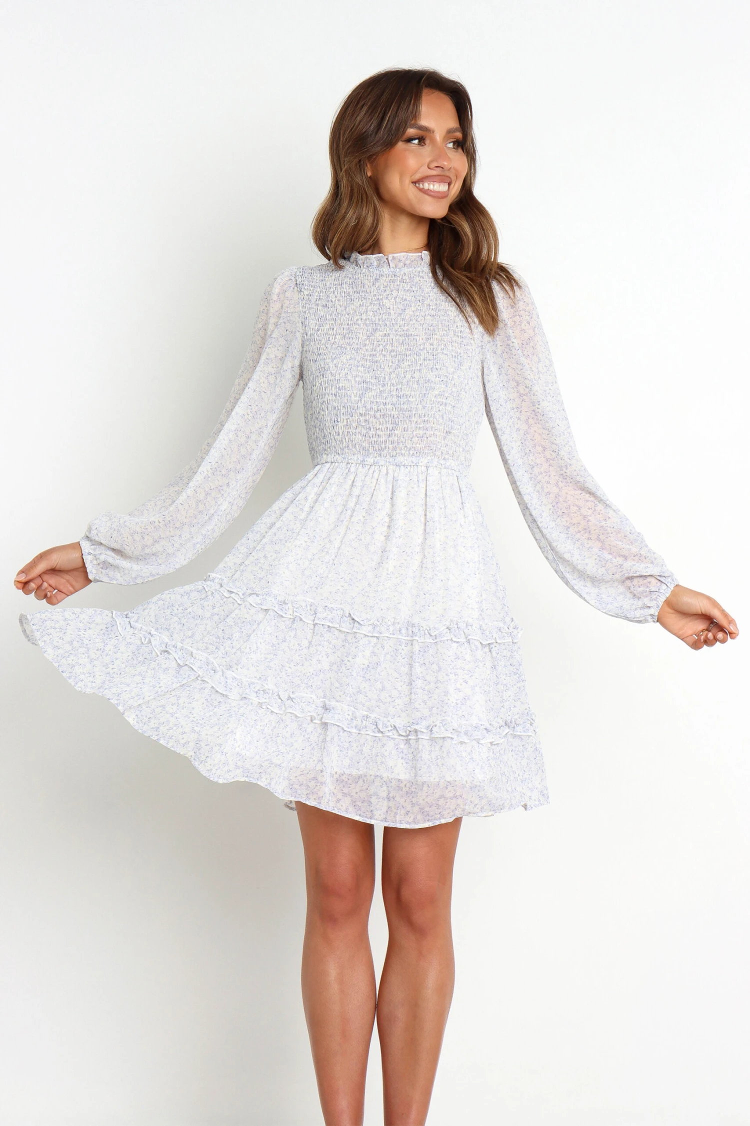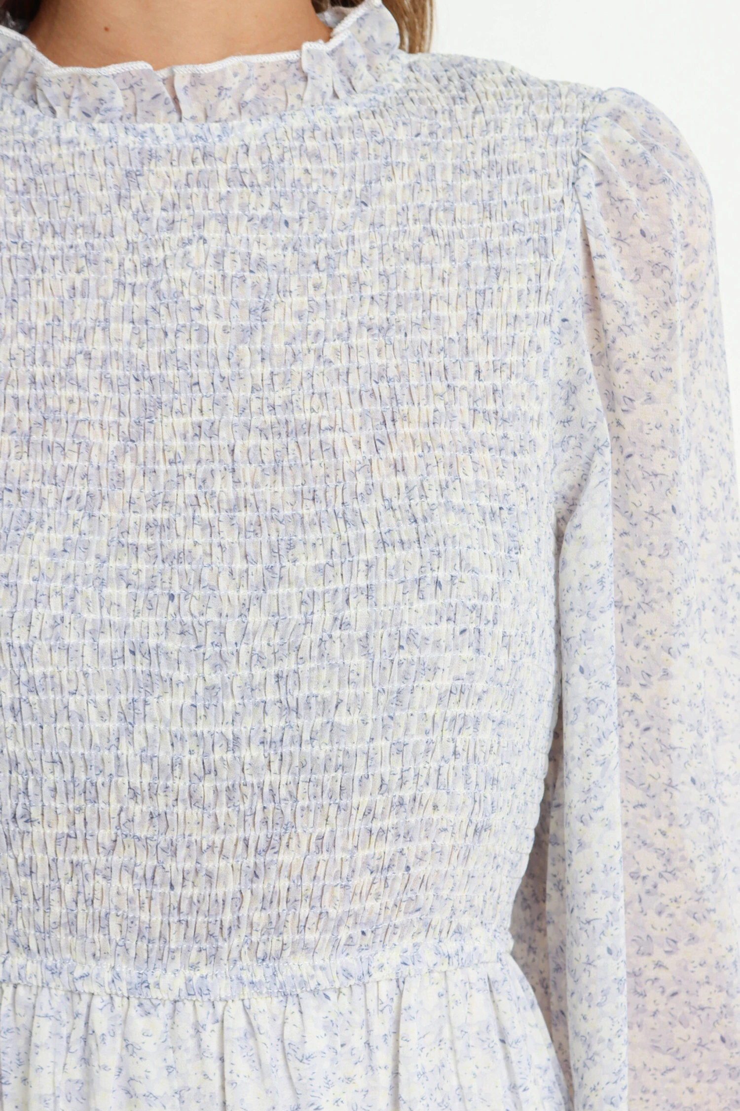 | DETAILS This above-knee length dress is sure to make heads turn! Featuring a high neckline with ruffle detail, a shirred bodice and long sleeves with elasticated cuffs, it’s an effortlessly flattering silhouette.
