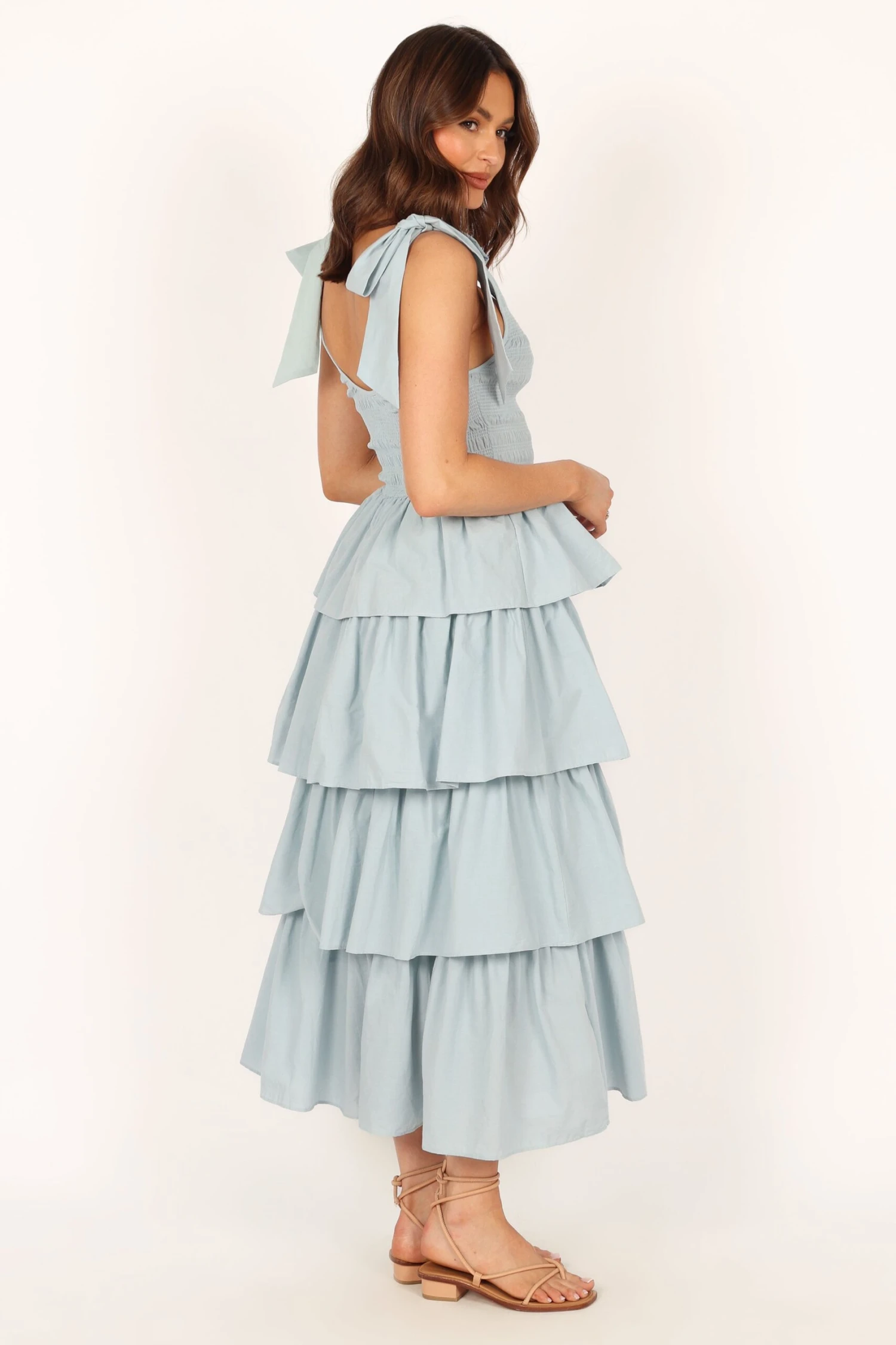 | DETAILS This gorgeous blue maxi dress is perfect to make a statement in! With its scoop neckline, tie close straps, shirred bodice and tiered layered skirt design it is sure to turn heads.