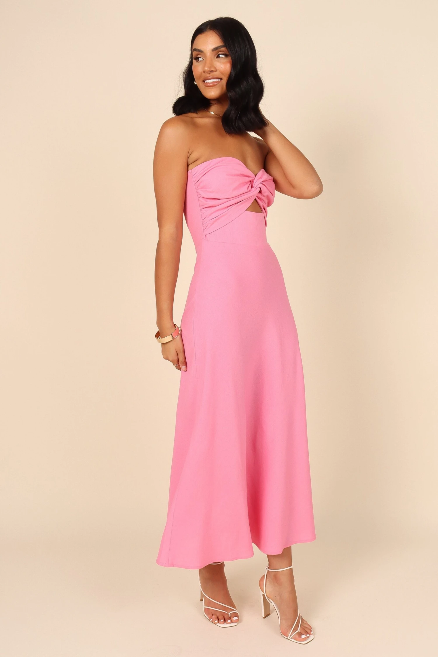 | DETAILS Our Rosetta maxi length dress is perfect for your next party. Boasting a strapless sweetheart neckline and curve-hugging fit, it’s sure to make you look amazing. There’s also a twist knot detail on the bust and a cut out feature under the bust for added style points.