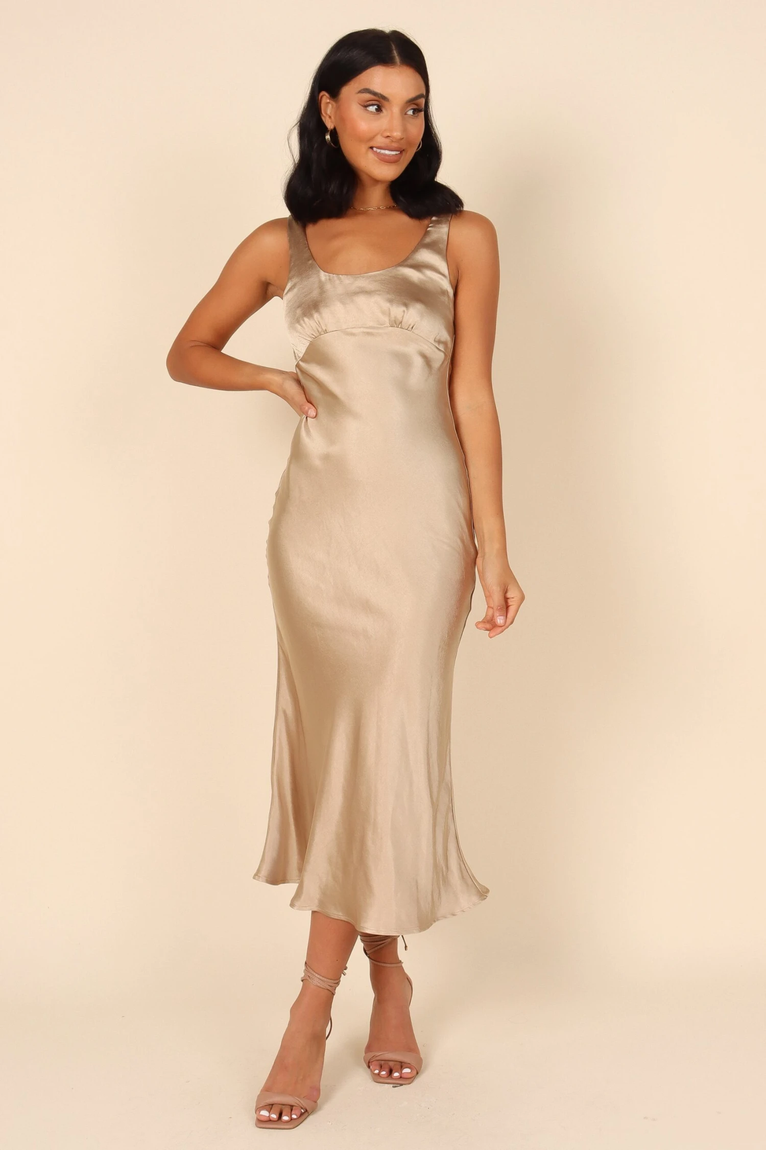 | DETAILS The perfect party dress is here! Look no further than this chic midi-length number that has all the bells and whistles you need. Featuring a round neckline with non-adjustable straps and a back neck opening with tie close detail, it shows off just the right amount of skin while giving you enough coverage too.