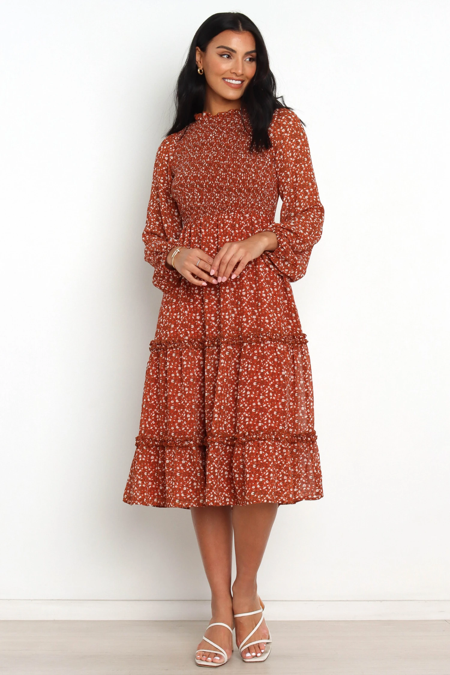 | DETAILS This midi dress is the perfect combination of fun, flirty and elegant! Featuring a round ruffle neckline and long sleeves with elasticised cuffs, it is sure to make you feel confident in any occasion.