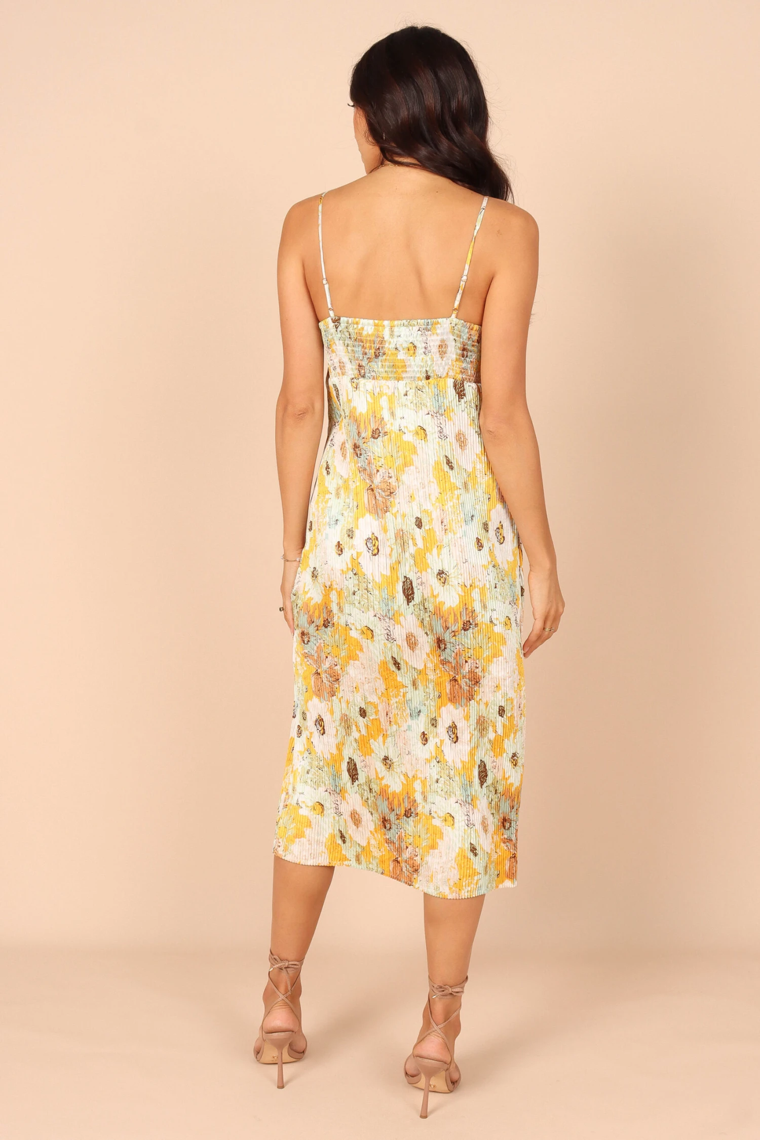 | DETAILS This midi length dress is perfect for any occasion! Featuring a v neckline, thin adjustable straps and a shirred back panel to ensure a comfortable fit. The pleated detailing throughout the dress gives extra movement and style while the floral print adds just the right touch of femininity.